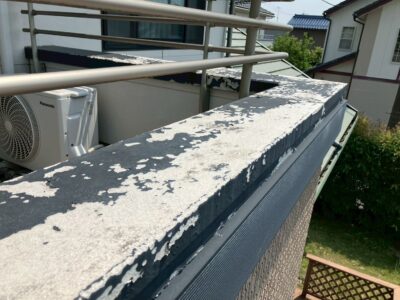 ベランダの笠木は表面の塗装がはがれ、かなり劣化が進んでいる状態でした💦