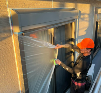 乾燥したら、サッシや窓まわり、玄関などをマスキングテープやビニールでしっかり覆います。